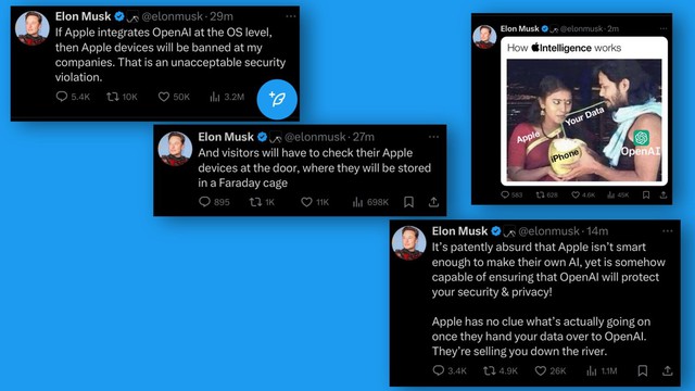 Bài đăng đầu tiên của ông gợi ý rằng nếu "Apple tích hợp OpenAI ở cấp độ hệ điều hành", ông sẽ cấm các thiết bị Apple tại các công ty của mình. Những người đến thăm công ty của ông sẽ phải để lại các thiết bị của họ trong một lồng Faraday.