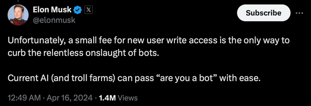 Trong một bài đăng trên X, Elon Musk trả lời người dùng rằng "phí nhỏ" để cho phép tài khoản mới đăng bài trên nền tảng là "cách duy nhất để ngăn chặn làn sóng tấn công không ngừng của các tài khoản bot." Ông cũng cho rằng các công cụ AI có thể dễ dàng vượt qua các bài kiểm tra "Bạn có phải robot không". Trong một bài đăng khác, chủ sở hữu của X cho biết những người dùng chọn không trả phí vẫn có thể theo dõi các tài khoản khác và đọc bài đăng miễn phí.