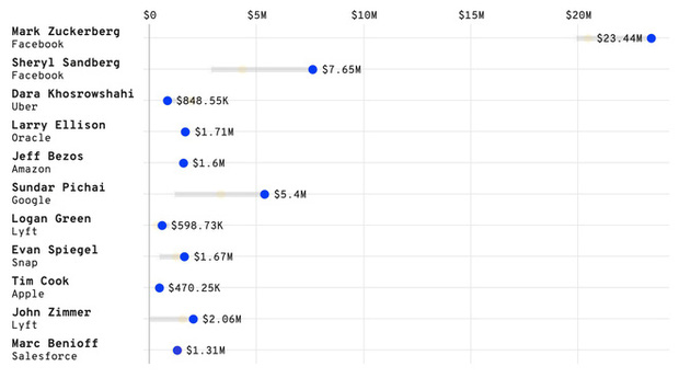 Danh sách chi phí an ninh bao gồm tổng cộng bao gồm 11 cá nhân. Ở vị trí thứ ba là Sundar Pichai của Google (5,4 triệu USD chi phí bảo vệ); tiếp theo là đồng sáng lập và chủ tịch Lyft John Zimmer (2,06 triệu USD); Larry Ellison của Oracle (1,71 triệu USD); Evan Spiegel của Snap (1,67 triệu USD); Jeff Bezos và ông chủ Salesforce, Marc Benioff (1,31 triệu USD); Dara Khosrowshahi của Uber (849.000 USD); CEO Lyft, Logan Green (599.000 USD) và Tim Cook của Apple (470.000 USD).