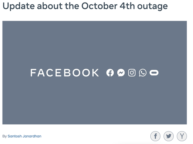 Điều này gây ra sự cố các dịch vụ của công ty ngưng hoạt động trong gần 6 tiếng, bắt đầu từ khoảng 22h ngày 4/10 (theo giờ Việt Nam). Đồng thời, ngăn 3,5 tỷ người dùng sử dụng các dịch vụ của công ty, bao gồm nền tảng Facebook, Messenger, Instagram, WhatsApp.