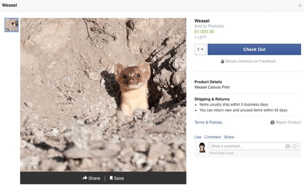 Thông tin một mẩu rao sản phẩm từ mục Facebook Shop cho các Trang - Ảnh: socialmediaexaminer.com |