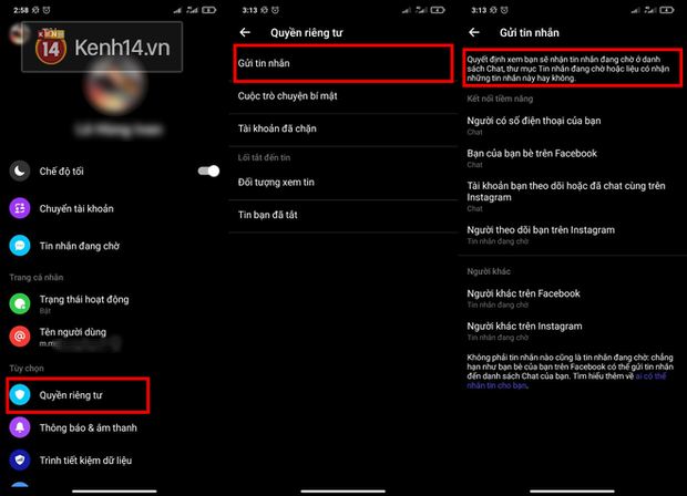 Bạn cuộn xuống "Quyền riêng tư" và chọn "Gửi tin nhắn". Điều này cho phép bạn tùy chỉnh những người có thể nhắn tin cho bạn trên ứng dụng - bạn bè trên Facebook của bạn, bất kỳ ai có số điện thoại của bạn,...