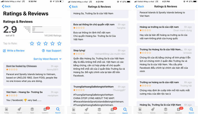 Nhiều tài khoản đã vào trang cá nhân của Mark Zuckerberg, CEO Facebook, để phản ánh. Trên cửa hàng CH Play và App Store, ứng dụng này đang nhận "bão một sao" từ người dùng. Đến tối ngày 16/4, ứng dụng còn 2,9 điểm trong kho App Store. Trên kho ứng dụng của cả Goolge và Apple, người Việt Nam đồng loạt bình luận với nội dung: "Trường Sa, Hoàng Sa là của Việt Nam. Yêu cầu Facebook 'đưa' hai quần đảo này lại bản đồ Việt Nam".