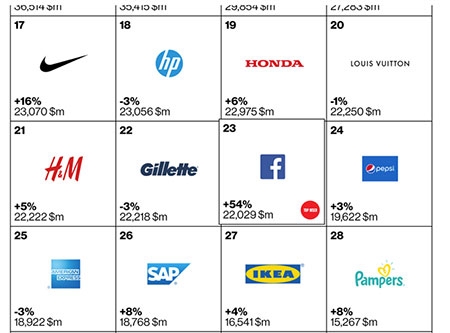 Tuy chưa thể lọt vào nhóm các thương hiệu hàng đầu, nhưng Facebook đang có mức tăng trưởng nhanh nhất thế giới. Mạng xã hội này tăng giá trị lên 54% so với năm 2014. Mức tăng này nhanh hơn cả Apple - thương hiệu đang đứng đầu bảng.
