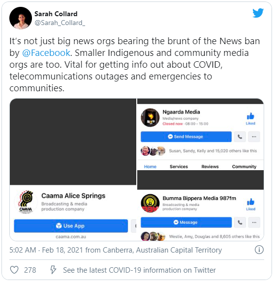 Việc mất đi nền tảng chia sẻ thông tin khẩn cấp quan trọng như trên là điều đặc biệt nghiêm trọng, khi nhiều người Úc đang phải sống trong các khu vực chịu ảnh hưởng bởi thời tiết cực đoan hoặc thảm họa thiên nhiên. Giờ đây, các dịch vụ thời tiết cũng như cấp cứu của chính phủ sẽ không thể gửi trực tiếp thông tin đến người dùng Facebook để giảm nhẹ tác động của các biến cố trên được nữa.