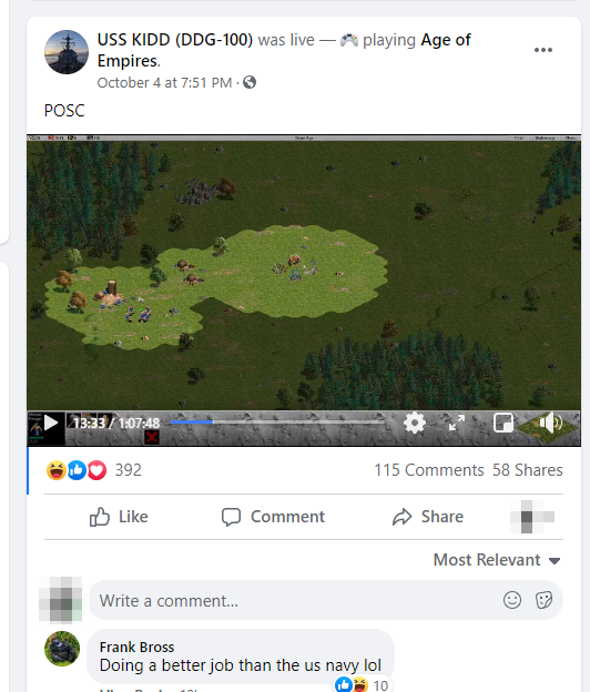 Được biết, trước khi bị hack, fanpage này vẫn liên tục đăng tải các bài viết có nội dung liên quan tới tàu khu trục USS Kidd. Tuy nhiên, vào lúc 9:26 sáng ngày 4/10 giờ địa phương, fanpage nafy liên tục phát 1 loạt video stream chơi AOE, kéo dài cho tới tận 19h51 buổi tối – cho thấy hacker đã chơi ‘liền tù tì’ Đế Chế trong hơn 10 tiếng!