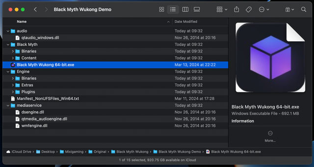 Thay vào đó, mọi sự chú ý được đổ dồn vào file "Black Myth Wukong 64-bit.exe". Đây là một file .exe, có dung lượng 692.1MB và hash md5 05eb129bc331d556a3330bdb262cb132.