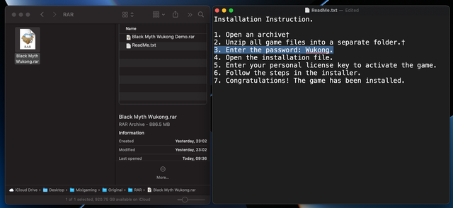 "Black Myth Wukong.rar" bao gồm 2 file nhỏ bên trong: "Black Myth Wukong Demo.rar" và "ReadMe.txt". Trong đó, Black Myth Wukong Demo.rar đã bị mã hóa (đặt mật khẩu), và Readme.txt chứa mật khẩu để giải mã. Mật khẩu của file RAR cũng được chia sẻ với Độ Mixi thông qua email trao đổi công việc.