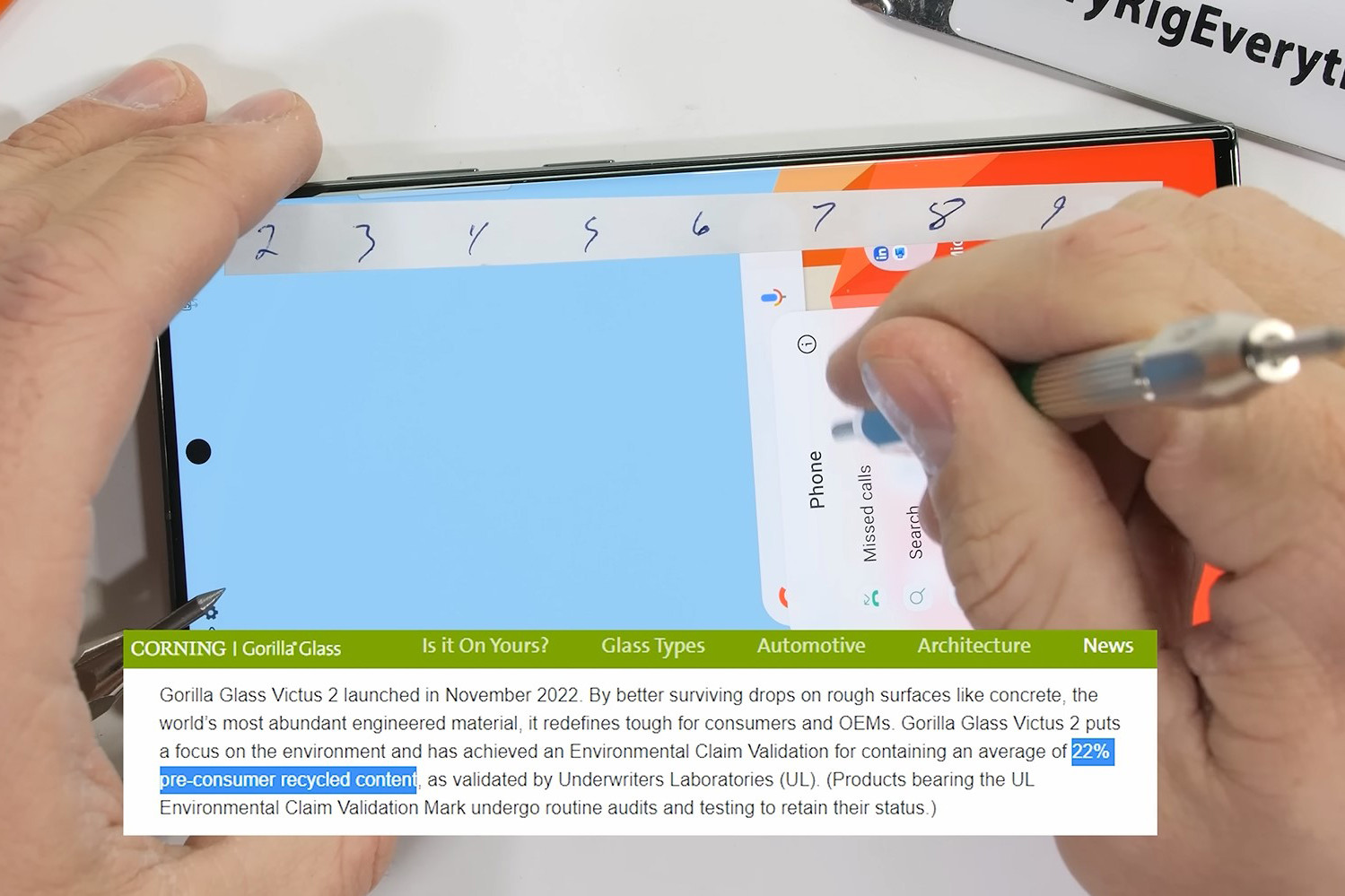 Ở màn thử nghiệm đầu tiên, màn hình của Galaxy S23 Ultra dừng bước ở mức độ 7 trong thang độ cứng Moh. Mặt kính phía trước với lớp bảo vệ Gorilla Glass Victus 2 cho thấy độ bền của một sản phẩm cao cấp, khi không bị trầy xước dù cố tình bị ma sát bởi dao rọc giấy.
