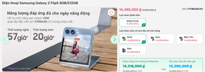 Sau khi Galaxy Z Flip6 ra mắt, giá Galaxy Z Flip5 liên tục giảm mạnh, số lượng máy fullbox cũng còn rất ít. Phiên bản 512GB hiếm hoi còn sót lại tại Việt Nam đang được bán với giá chỉ 14.490.000 đồng, giảm hơn nửa giá so với thời điểm mới ra mắt, AI xịn “chặt đẹp” iPhone 15.