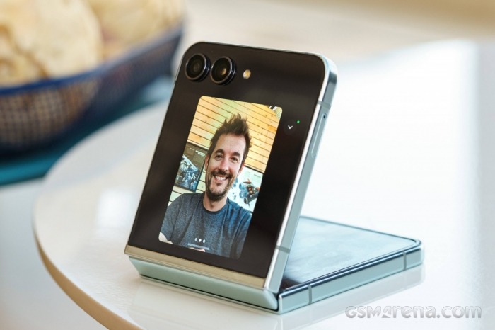 Cơ chế bản lề mới giúp Galaxy Z Flip5 gập khít hoàn toàn, không có kẽ hở và giúp màn hình trở nên liền mạch, nhìn kỹ mới thấy nếp gấp. Mặt lưng nửa dưới được phủ màu trơn còn phía trên chứa màn hình phụ lớn 3.4 inch mà Samsung gọi là Flex Window.