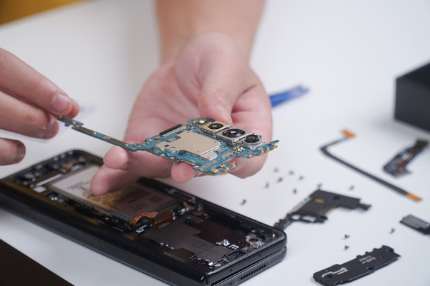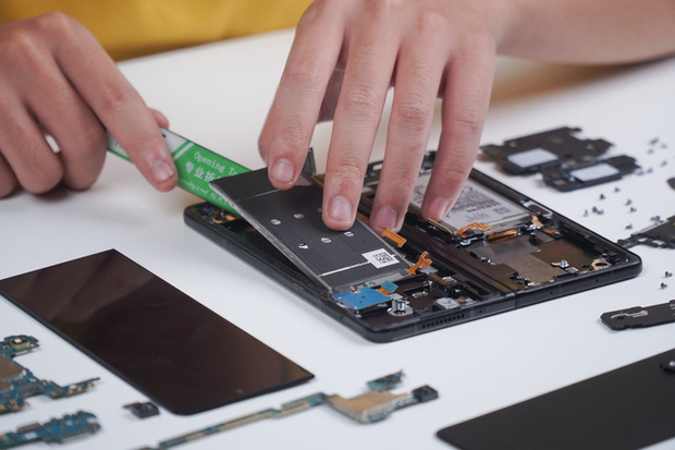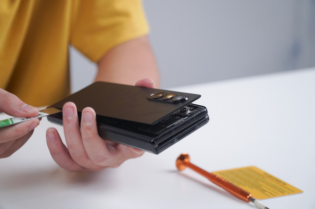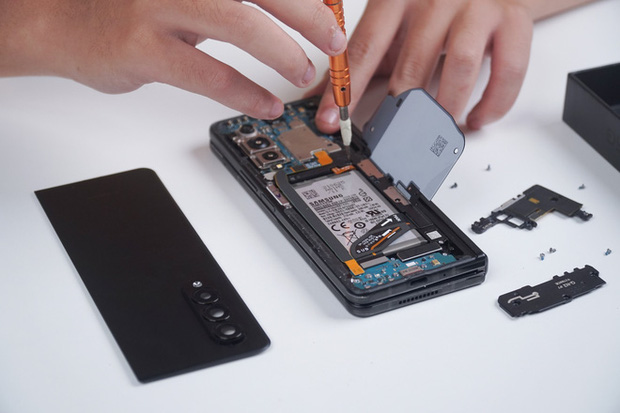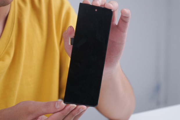 Thành phần phức tạp nhất để sửa chữa trên Galaxy Z Fold3 chính là màn hình chính. Màn hình này được gắn trực tiếp vào khung của máy, và để tách rời nó ra sẽ cần một kỹ thuật mang tên "tách lạnh", yêu cầu trang thiết bị đặc biệt mà không phải cửa hàng nào cũng có. Cộng thêm chi phí cho linh kiện màn hình rất cao (hiện chưa có sẵn trên thị trường, nhưng chắc chắn phải trên 10 triệu đồng), thay màn hình Galaxy Z Fold3 sẽ không chỉ làm khó cho các kỹ thuật viên, mà còn là với ví tiền của người tiêu dùng.