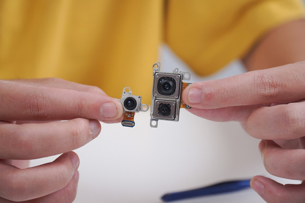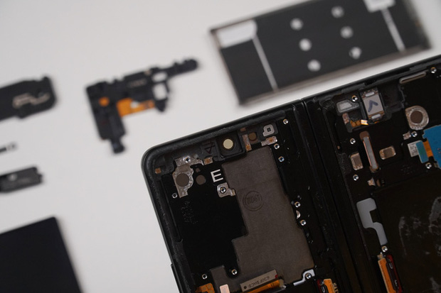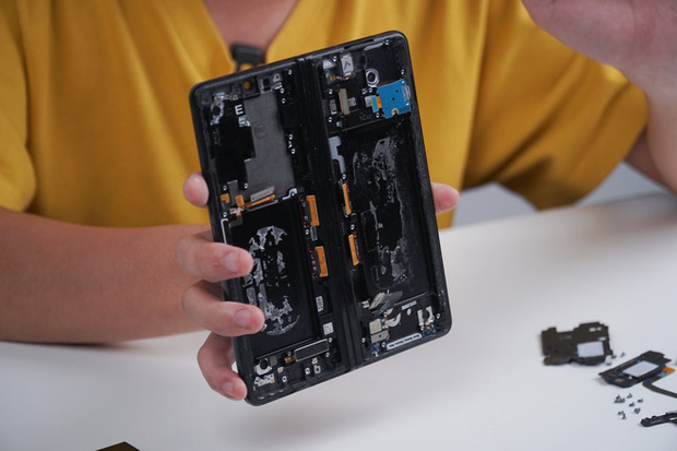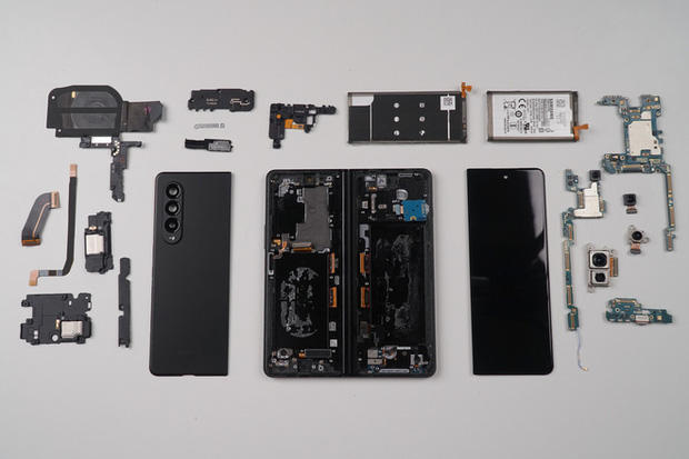 Đối với các thành phần còn lại, về cơ bản, Galaxy Z Fold2 vẫn có thể sửa chữa như một chiếc điện thoại thông thường. Các thành phần linh kiện chính của máy như bo mạch chủ, pin, camera, loa, cổng sạc… đều có thể dễ dàng thay thế sau khi sử dụng nhiệt để tháo rời nắp lưng. Tuy nhiên do tính chất của smartphone màn hình gập, vậy nên Galaxy Z Fold3 cũng có một số điểm khác biệt. Ví dụ, máy có đến hai viên pin nằm ở hai nửa màn hình với dung lượng và kích thước khác nhau, hai hai bo mạch bao gồm một bo mạch chính và một bo mạch phụ.