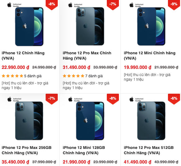 Hai mẫu cao cấp hơn, iPhone 12 Pro và 12 Pro Max, trên kệ hàng chính hãng cũng được nhiều cửa hàng hạ giá. Các phiên bản dung lượng thấp nhất (128 GB) xuống 27,5 và 30 triệu đồng, thấp hơn mức chào bán tuần trước từ 3,5 đến 4 triệu đồng. Mức khởi điểm ban đầu của iPhone 12 Pro và 12 Pro chính hãng là 31 và 34 triệu đồng.
