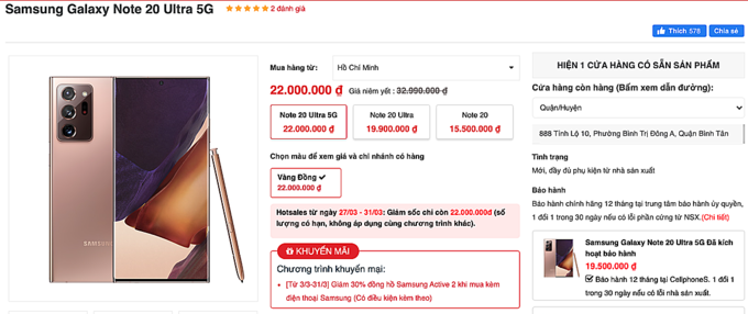 Cuối tháng 3, các hệ thống lớn đồng loạt điều chỉnh giá của mẫu Galaxy Note20 Ultra 5G. Bản 256 GB giảm từ 32,9 triệu đồng xuống còn 21,4 triệu đồng.
