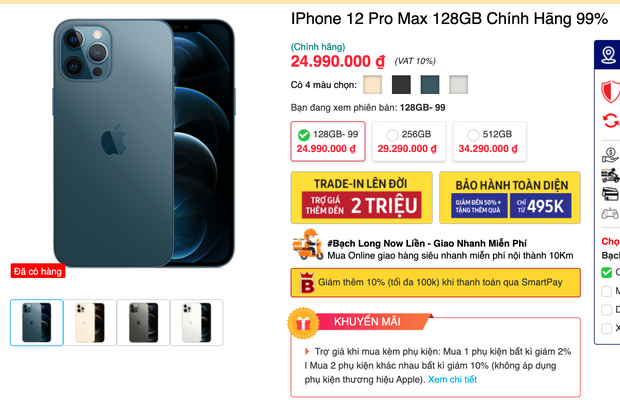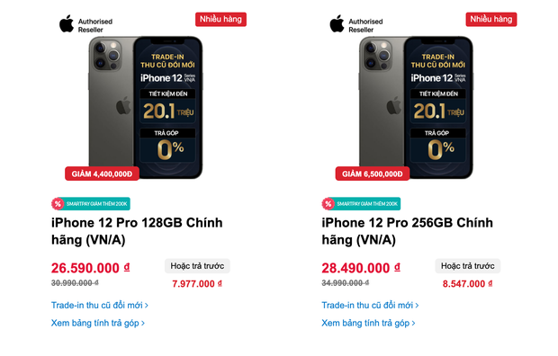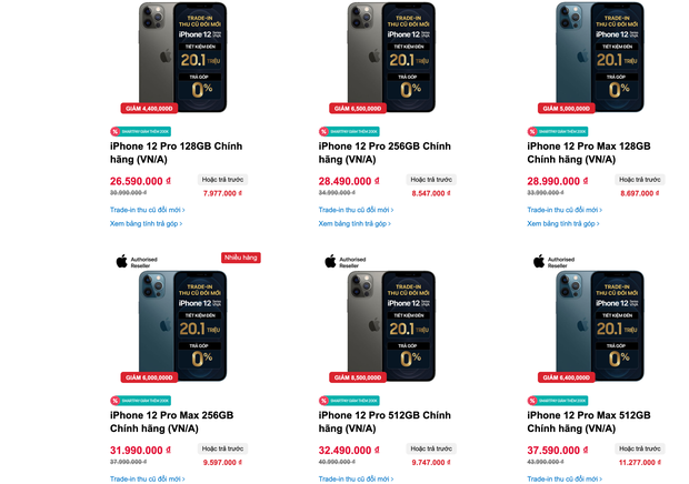 Ngoài ra, các dòng iPhone 12 Pro cũng đang được nhiều đại lý bán giá giảm sâu từ 4-6 triệu đồng, tuỳ vào dung lượng bộ nhớ. iPhone 12 Pro 128GB giảm hơn 4 triệu chỉ còn 26,6 triệu đồng. iPhone 12 Pro 256GB giảm sâu hơn chỉ còn 28,5 triệu đồng.
