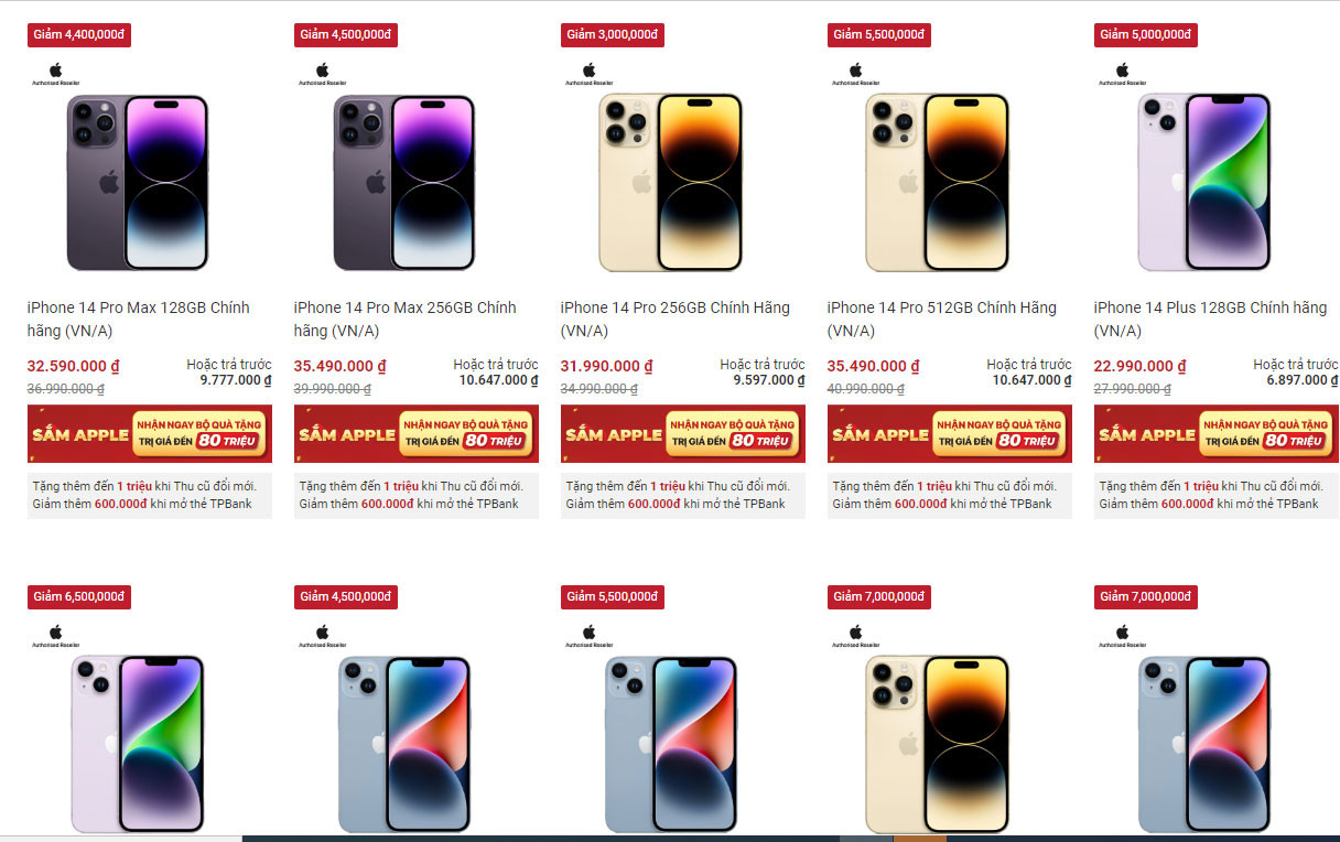 Thời điểm này, nhiều hệ thống bán lẻ điện thoại di động tại Việt Nam đang mạnh tay hạ giá các dòng iPhone 14 và iPhone 14 Plus có dung lượng lớn.