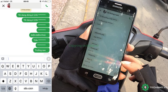 Trong phần trò chuyện với tài xế, người này nhắn “Tôi đang đứng tại 110 Trường Sa”. Ngay lập tức ứng dụng chuyển đoạn tin nhắn thành “Tôi đang đứng tại 110 *********”.