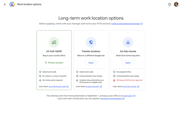 Google hôm 22/6 bắt đầu triển khai công cụ để nhân viên yêu cầu chuyển đổi văn phòng hoặc đăng ký làm việc từ xa hoàn toàn. Hồi tháng 5, CEO Google Sundar Pichai thông báo kế hoạch đưa 20% nhân sự làm việc từ xa vĩnh viễn, 20% có thể làm việc tại một văn phòng Google khác nếu muốn. 60% còn lại vẫn làm tại địa điểm cũ vài ngày một tuần.