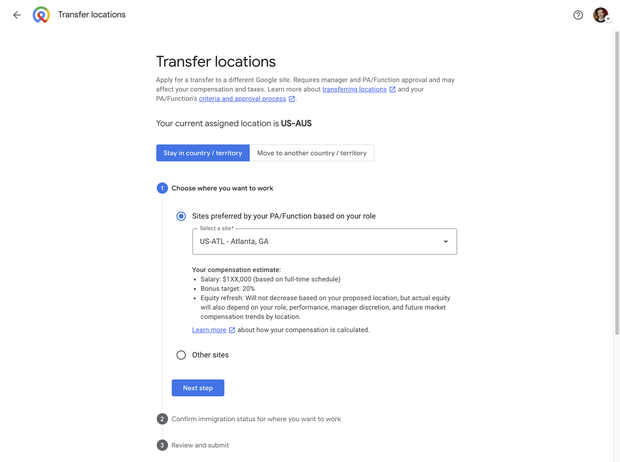Nếu nhân viên Google yêu cầu chuyển sang văn phòng mới, thu nhập của họ sẽ được điều chỉnh với mức sống trong khu vực. Chẳng hạn, nếu họ chuyển từ San Francisco hay New York sang thành phố nhỏ hơn, họ có thể bị giảm lương. Phần mềm của Google sẽ giúp họ biết được lương của mình thay đổi ra sao tùy theo địa điểm.