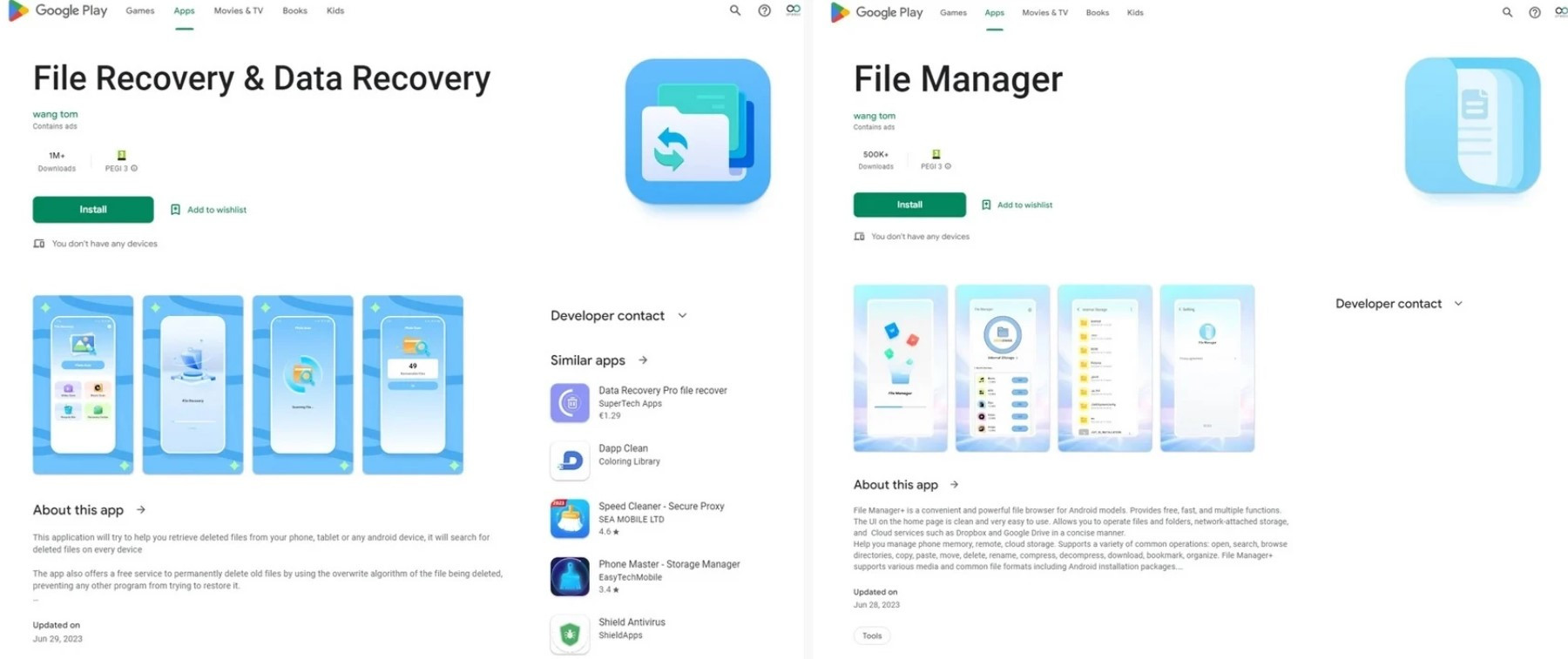 Cả 2 ứng dụng đều đến từ cùng một nhà phát triển có tên wang tom. Ứng dụng File Recovery & Data Recovery đã có hơn 1 triệu lần tải và cài đặt trên Google Play. Trong khi đó, ứng dụng File Manager cũng đã có hơn 500.000 lượt tải và cài đặt.