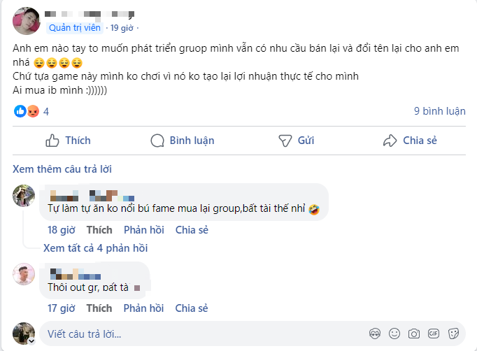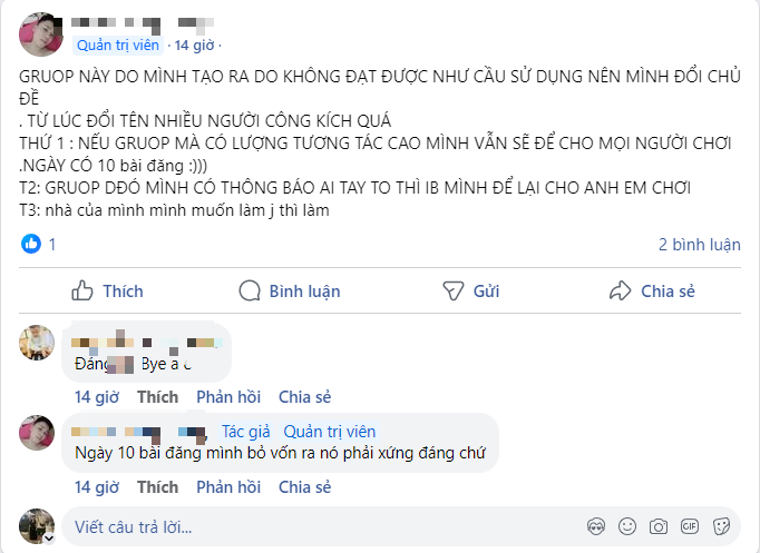 Quan trọng hơn, khi vấp phải sự phản đối mạnh mẽ từ phía đông đảo thành viên, anh chàng này còn liên tục tung ra những lời thách thức, cho rằng group là của mình và do đó, bản thân có toàn quyền quyết định. Thậm chí, anh chàng này còn khiêu khích, cho rằng nếu như ai đó muốn mua lại thì mình sẵn sàng bán ngay khi được giá.