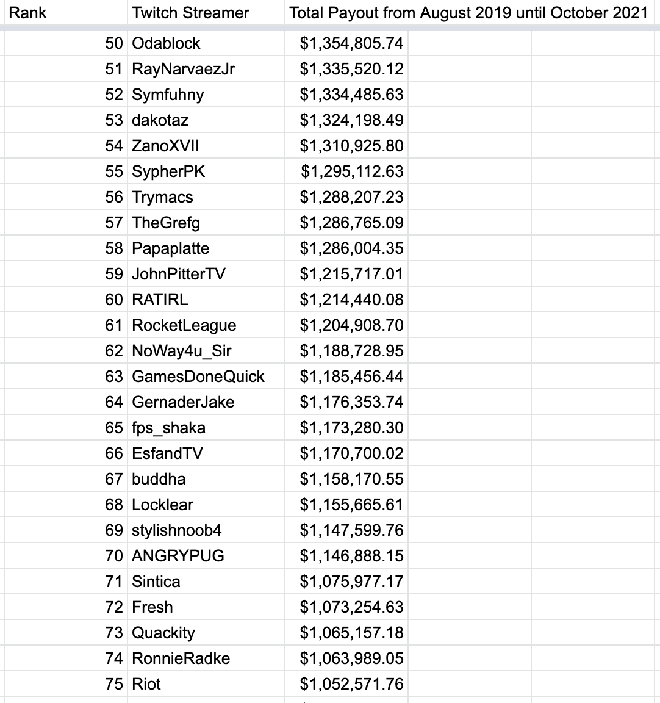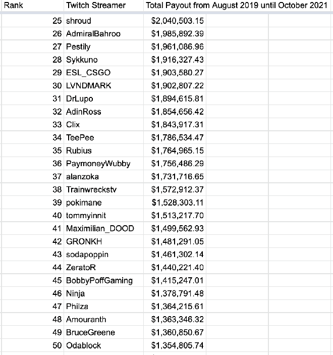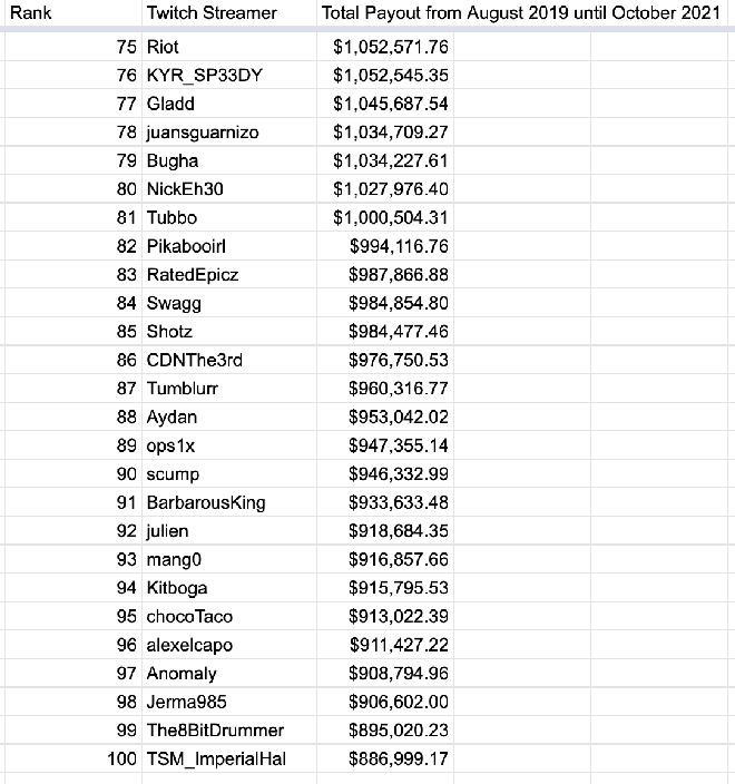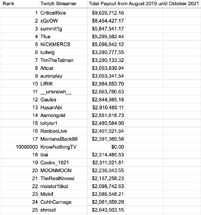 Trên Twitter, tài khoản có tên @KnowS0mething đã tổng hợp danh sách 100 tài khoản được Twitch trả nhiều nhất trong khoảng thời gian từ 8/2019 cho tới 10/2021.