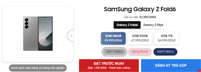 Tại Việt Nam, giá bán hai mẫu điện thoại này cũng được công bố tại sự kiện do Samsung Việt Nam tổ chức song song với buổi ra mắt tại Pháp. Theo đó, giá bán Galaxy Z Fold 6 dung lượng 256GB - 1TB dao động từ 43,99 - 54,99 triệu đồng. Galaxy Z Flip 6 dung lượng 256 - 512GB có giá 28,99 - 32,99 triệu đồng.