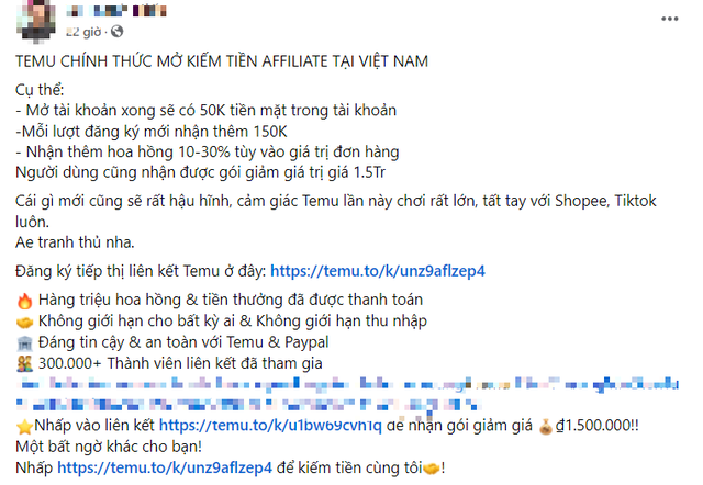 Chẳng hạn, tại một hội nhóm trên Facebook có tên Cộng đồng Affiliate Temu_Việt Nam (hơn 28.000 thành viên), một tài khoản N.P nêu có 3 cách kiếm tiền triệu từ Temu. Cụ thể, kiếm được 30% hoa hồng nếu giới thiệu được người dùng mua hàng giá trị trên 2,4 triệu đồng hoặc giới thiệu người dùng ứng dụng mới được 150.000 đồng...