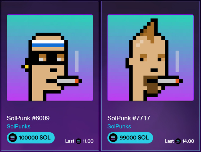 Một ví dụ điển hình là Solanart.io, nơi trưng bày và giao dịch vô số vật phẩm NFT theo các chủ đề khác nhau. Mức giá của chúng cũng rất đa dạng, trải dài từ 50 SOL (đồng tiền mã hóa Solana) cho đến mức 100.000 SOL. Với giá mỗi đồng SOL hiện đang dao động quanh mức 140 USD, nghĩa là vật phẩm NFT kể trên đang được bán với giá 14 triệu USD, tương đương hơn 300 tỷ VNĐ.