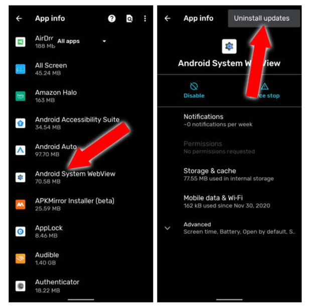 Bấm vào Android System Webview, bấm vào menu phía trên bên phải và chọn Uninstall updates. Thao tác này sẽ không xóa hoàn toàn System Webview, nhưng sẽ loại bỏ bản cập nhật mới nhất. Cuối cùng chọn Ok để xác nhận.