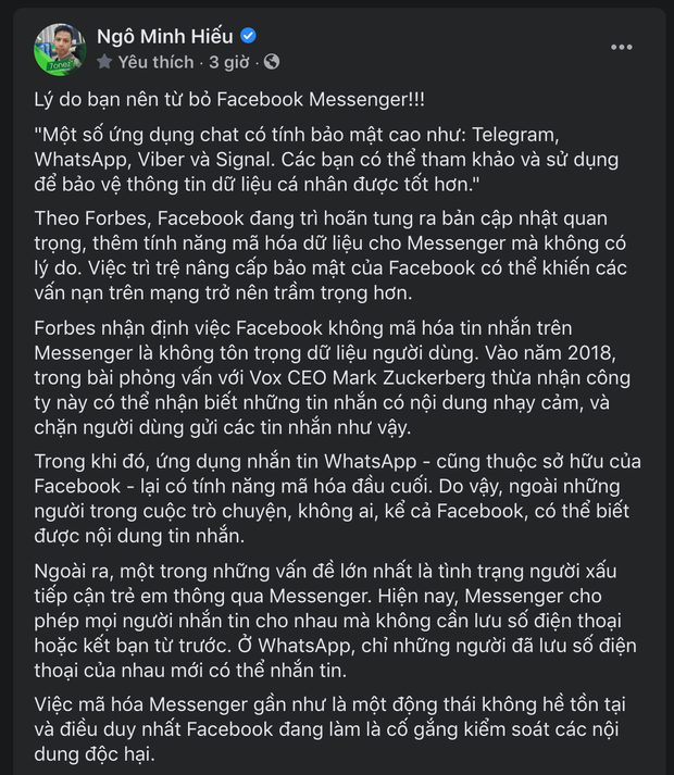 Mới đây trên trang Facebook cá nhân của mình, Hiếu PC đã đưa ra lý do để mọi người nên từ bỏ nền tảng nhắn tin hàng đầu hiện nay - Messenger. Điều này đã khiến không ít người lo ngại khi nền tảng nhắn tin này đang cực kỳ phổ biến tại Việt Nam.