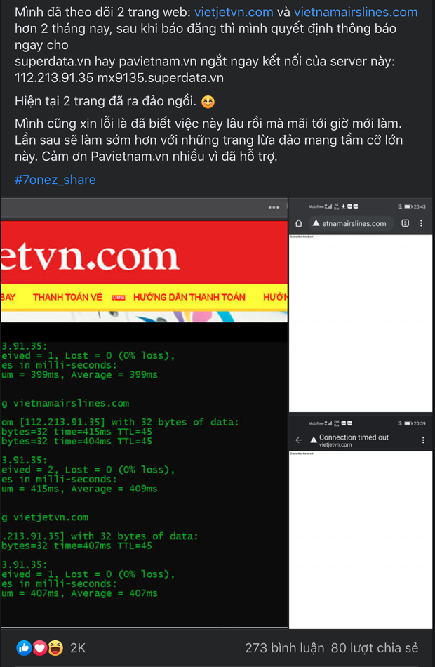 Mới đây, Hiếu PC vừa chia sẻ trên diễn đàn của mình về việc anh đã đánh sập 2 trang web giả lừa đảo mua vé máy bay. Đây là 2 trang web giả mạo Vietjet Air và Vietnam Airline có đường link giống gần như 99% so với trang web gốc.