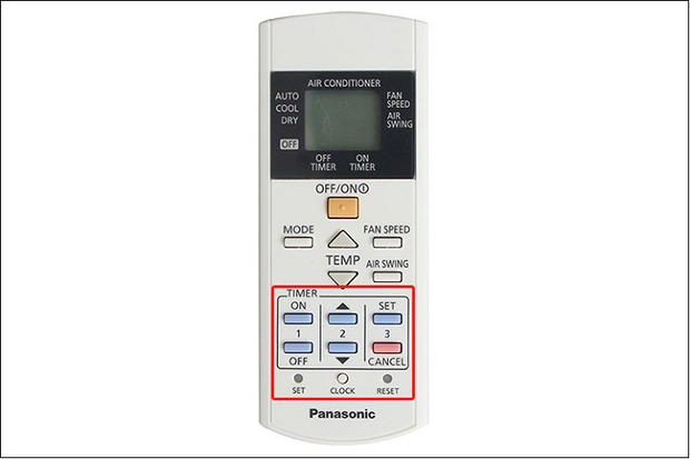 Trên điều khiển, ở hình ảnh minh họa của chúng ta là điều khiển của máy lạnh Panasonic, chú ý vào khu vực Timer. Để hẹn giờ bật máy: