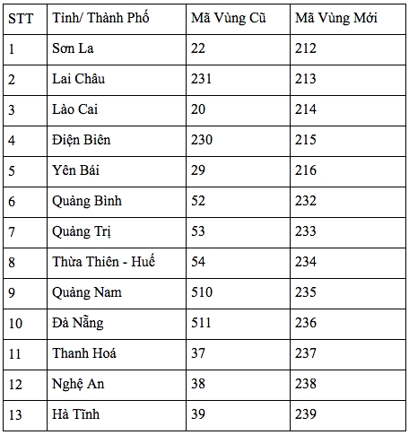 | Chi tiết Mã vùng mới của 13 tỉnh, thành phố giai đoạn 1 |