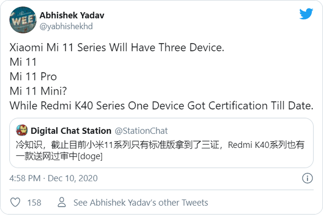 Trên thực tế, đây không phải lần đầu tiên có thông tin cho rằng Xiaomi sẽ ra mắt phiên bản Mini cho flagship dòng Mi. Vào tháng 10, Lu Weibing - phó chủ tịch tập đoàn Xiaomi, từng ám chỉ về việc công ty sẽ sản xuất một chiếc điện thoại nhỏ gọn, có thể cạnh tranh được với iPhone 12 Mini. Đây cũng là bằng chứng cho thấy hãng đang chuẩn bị cho sự ra mắt của Mi 11 Mini.
