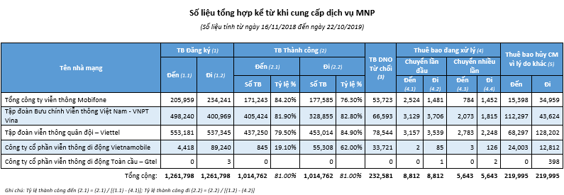 Xét về tổng thể, đã có tổng cộng 1,26 triệu thuê bao đăng ký chuyển mạng kể từ khi dịch vụ này được triển khai. Tổng số thuê bao chuyển mạng thành công là hơn 1 triệu, chiếm 81% số người dùng đăng ký chuyển mạng.
