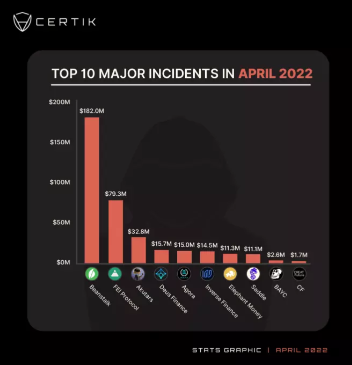 Trong khoảng thời gian này, có 31 dự án bị tấn công mạng. Beanstalk - một stablecoin phi tập trung dựa trên tín dụng là dự án blockchain chịu thiệt hại nặng nền nhất với tổng cộng 182 triệu USD bị hacker lấy đi.