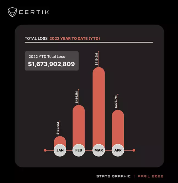 Đây là thông tin vừa được công bố mới đây bởi Certik - công ty bảo mật chuyên về lĩnh vực blockchain. Cụ thể, theo báo cáo của Certik, hơn 376,7 triệu USD đã bị hacker lấy khỏi các dự án tiền mã hóa chỉ trong tháng 4.