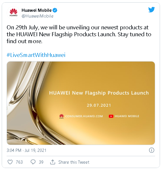 Chiếc smartphone flagship tiếp theo của Huawei là P50, sẽ chính thức được ra mắt vào ngày 29 tháng 7 tới đây. Sau nhiều lần bị trì hoãn, Huawei đã công bố trên trang Weibo của mình. Giám đốc mảng tiêu dùng của Huawei, ông Richard Yu cho biết rằng chiếc smartphone này sẽ đánh dấu “kỷ nguyên mới của chụp hình di động”, cho thấy camera sẽ là trọng tâm chính của P50.