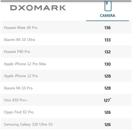 Các mẫu điện thoại thông minh mới của Apple như iPhone 12 Pro Max và iPhone 12 Pro lần lượt chiếm vị trí thứ 4 và thứ 5 với 130 điểm và 128 điểm. DXOMARK cho biết, iPhone 12 Pro Max có chức năng chụp ảnh ấn tượng nhất trong số các điện thoại thông minh của Apple đã ra mắt cho đến nay. Nhưng đạt điểm tương đối thấp trong các chức năng như zoom và dải tương phản động. Ngoài ra, Mi10 Pro của Xiaomi cũng đạt 128 điểm và đứng ở vị trí thứ 5, trong khi X50 Pro Plus của Vivo đứng thứ 7 với 127 điểm.