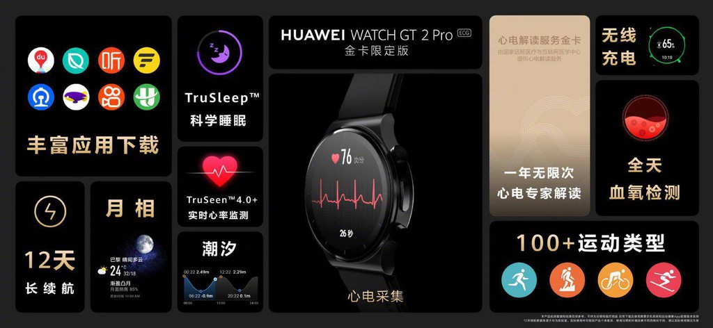 Ngoài một số tính năng quen thuộc như theo dõi nhịp tim, theo dõi oxy trong máu, đo giấc ngủ và căng thẳng cùng 100 chế độ tập luyện. Bổ sung giá trị nhất trên thiết bị mới này chính là tính năng đo điện tâm đồ ECG nên Watch GT 2 Pro ECG có giá cao hơn một chút, cụ thể là 478 USD (khoảng 10,9 triệu đồng).
