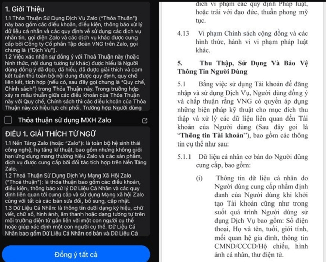 Theo báo Lao Động, Zalo tự công bố mỗi ngày có khoảng 2 tỷ tin nhắn được gửi qua nền tảng này. Tuy nhiên những ngày gần đây, nhiều người dùng hoang mang vì điều khoản mới, trong đó có nội dung được hiểu là Zalo có quyền thu thập, chia sẻ và lưu trữ dữ liệu cá nhân. Tiền Phong cũng cho biết nếu người dùng không đồng ý, tài khoản có thể bị khóa, khiến nỗi lo về quyền riêng tư và khả năng kiểm soát dữ liệu cá nhân càng tăng.
