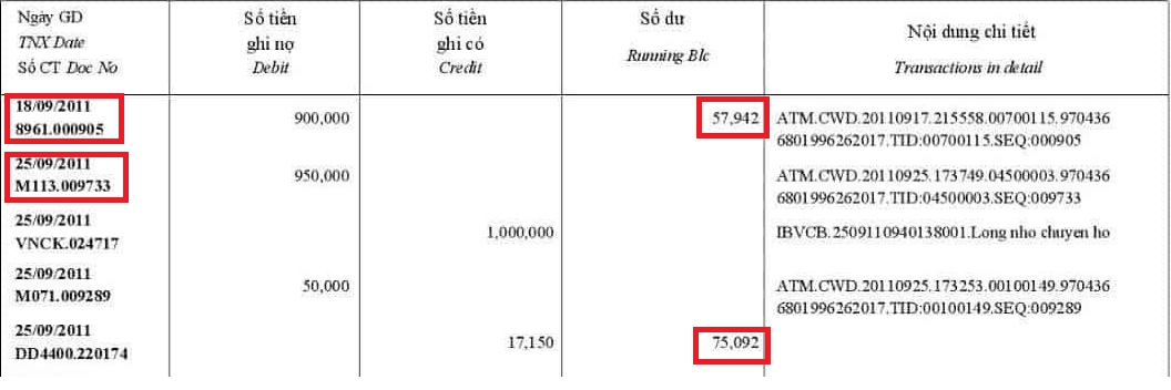 Ví dụ: Ngày 18/9 có 1 giao dịch thì số dư 57.942 đồng sẽ được chốt tại thời điểm thực hiện giao dịch cuối cùng là 900.000 đồng. Nhưng ngày 25/9 có 4 giao dịch thì số dư 75.092 đồng được ngân hàng chốt vào thời điểm cuối ngày, tương ứng với giao dịch cuối cùng là 17.150 đồng.