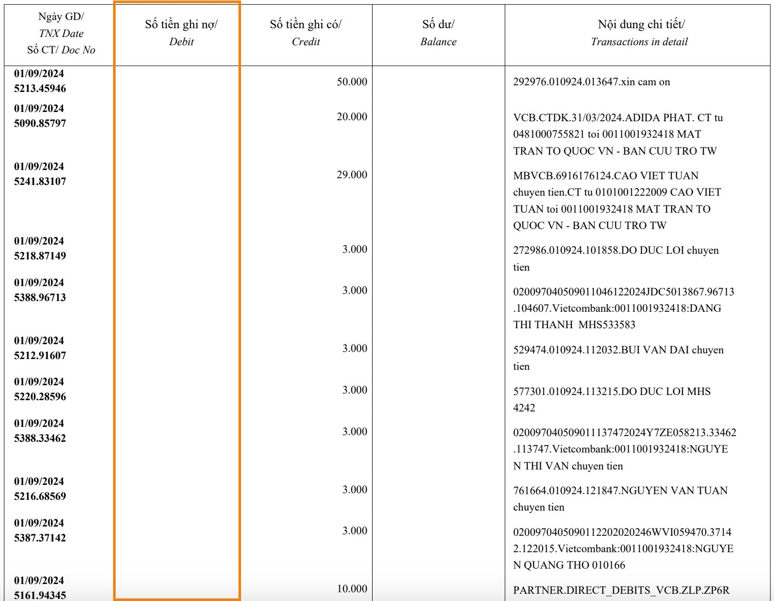 Số tiền ghi nợ là số tiền được chuyển đi từ tài khoản của bạn. Nói dễ hiểu, con số xuất hiện trong cột "số tiền ghi nợ" là số tiền mà bạn đã chuyển đi. Có thể cho mục đích tiêu dùng, trả nợ,...