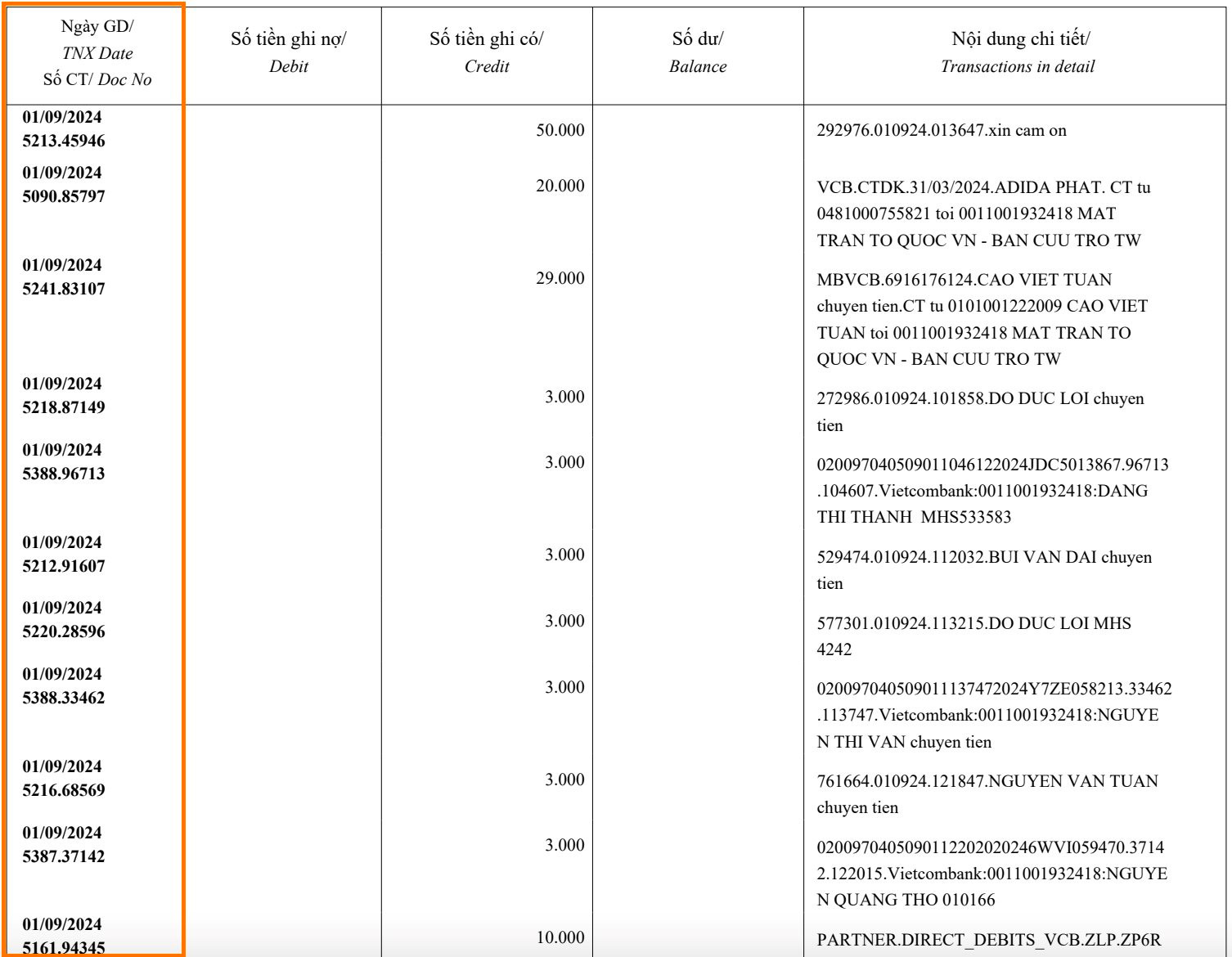 Cách đọc sao kê tài khoản