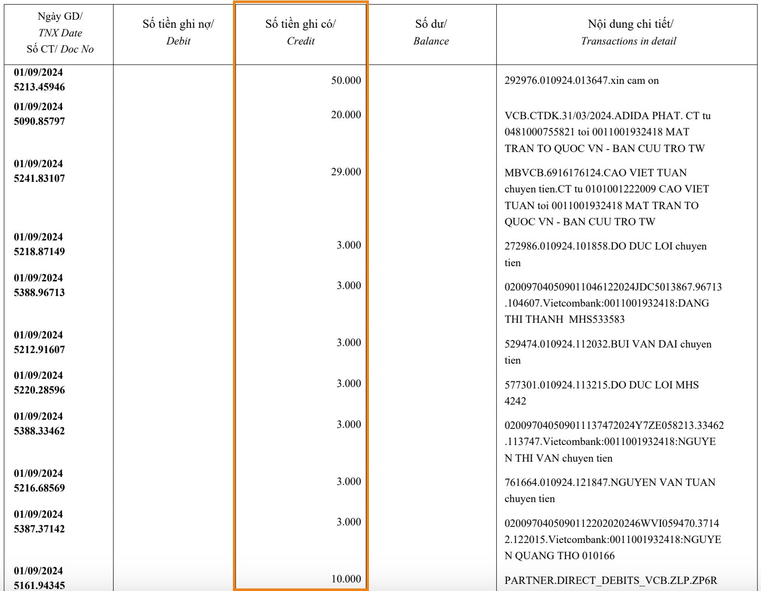 Hiểu đơn giản, những con số được ghi trong cột "số tiền ghi có" là số tiền mà người khác chuyển vào tài khoản của bạn. Đó có thể là tiền lương, tiền lãi hay tiền quyên góp,...