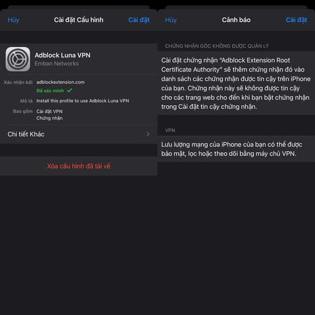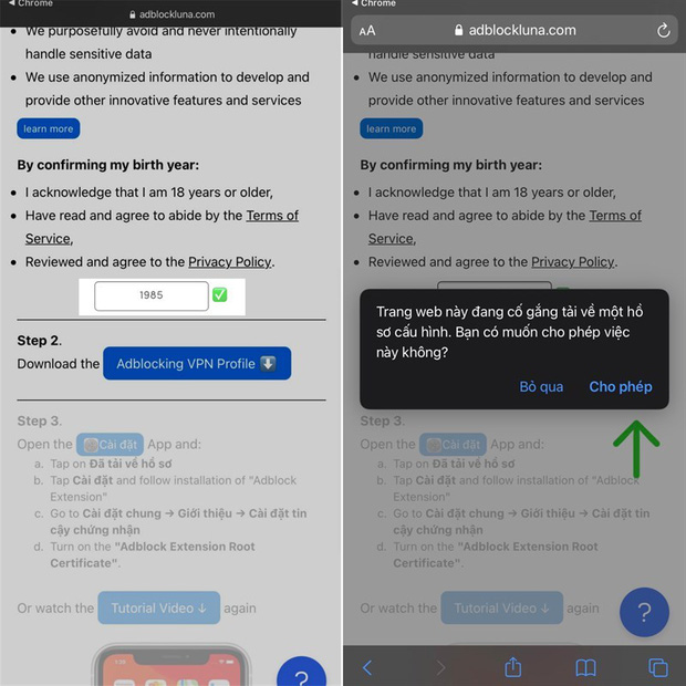 Người dùng iPhone có thể vào địa chỉ adblockluna.com/install, nhập năm sinh, và bấm "Download the Adblocking VPN Profile". Nếu được hỏi lại, người dùng bấm "Cho phép" để tiến hành.