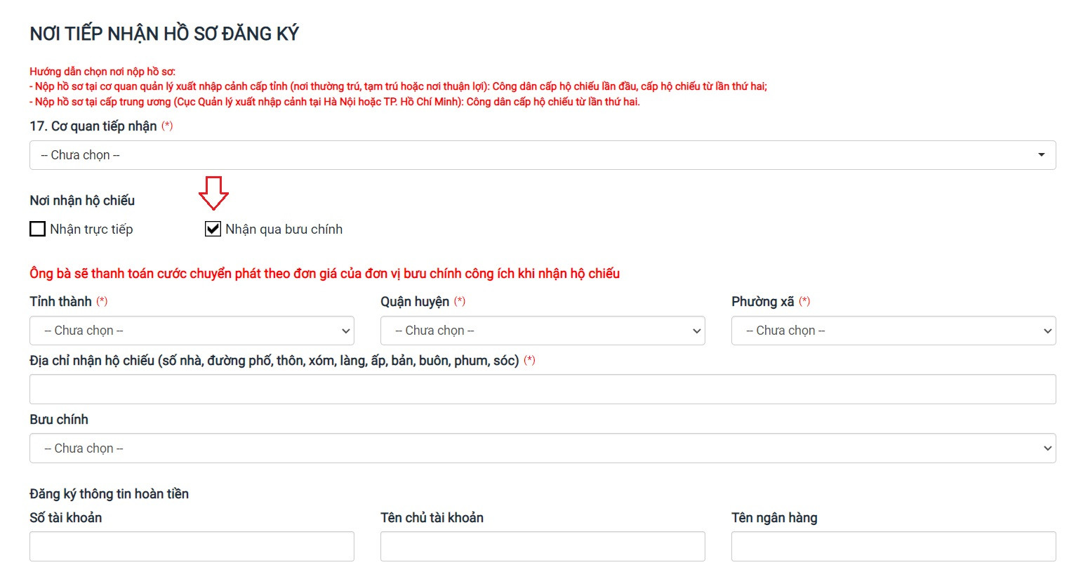 Trường hợp 2: Nhận qua dịch vụ bưu chính, bạn ghi rõ địa chỉ, thông tin người nhận hộ chiếu. Sau đó thanh toán lệ phí trực tuyến khi được cán bộ tiếp nhận hồ sơ gửi yêu cầu.