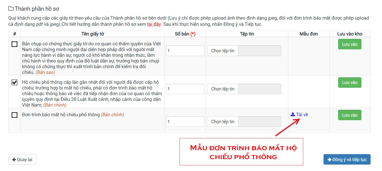 Bạn thực hiện tải các mẫu đơn có sẵn và thực hiện cung cấp đầy đủ các giấy tờ (nếu có) theo yêu cầu để được duyệt hồ sơ. Ví dụ, nếu cấp lại hộ chiếu lần 2, bạn cần tải hình hộ chiếu cũ lên mục Hộ chiếu phổ thông cấp lần gần nhất đối với người đã được cấp hộ chiếu...